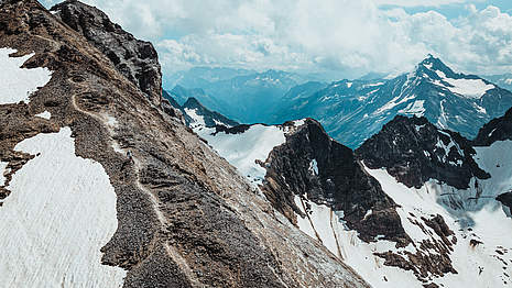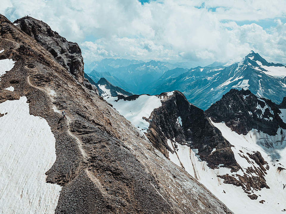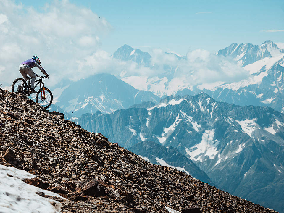 Gee Atherton: "We scouted the very top peak of Titlis when we were in Engelberg earlier this year. Although there was a lot of snow around, we could immediately tell that it was going to be a pretty impressive spot, so we marked it as a key location for filming. When we came back in the summer, the line had cleared up perfectly. It was exactly as we imagined. I started right at the peak, where there’s this triangle marker and a 360-degree view around you. The ridge runs sharply down toward Engelberg, and it’s super steep, rocky, and narrow. The first time we rode it, it was terrifying. There are big drops on the left, and so many sharp, jagged rocks. When you find a good line, it’s worth spending some time on it, getting to know it. After a few runs, you start to relax and know where to push, where to brake, and how fast you can go. And that’s when it starts to look natural. We rode it a few times until we were comfortable, and it became an amazing line. With rocks flying off my back wheel, I rode that rocky, narrow ridge as fast as I could. It felt like I was balancing on top of the world. The feeling of speed, with the drone chasing me, and that incredible backdrop—it’s one of my favorite scenes in the whole video."