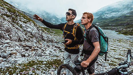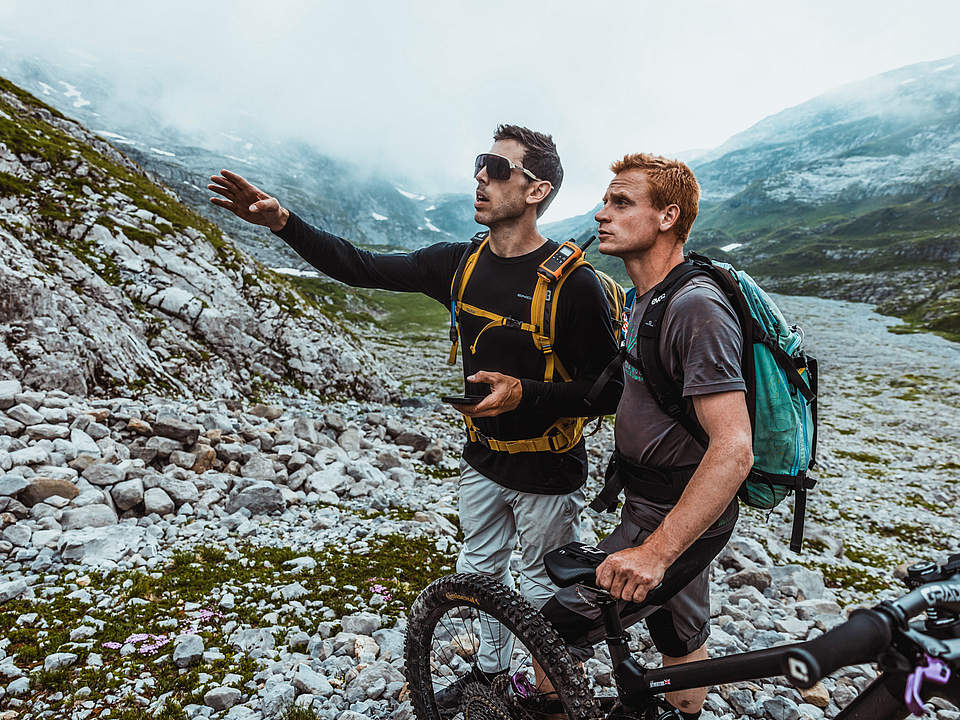 Gee Atherton: "The mountains were breathtaking, and the access was really good. We used the lifts when we could, and then hiked the rest of the way, which can be difficult with all the gear, but we’re used to it. Every time we got to the top of a peak, the view was just amazing. You could see vast mountain ranges stretching out into the distance. The scenery was stunning—greenery below, snow-capped peaks, lakes. Just incredible. As for riding, we found some amazing spots, but also some really hard sections. These mountains are big, and the terrain is serious. We had to be careful. One slip could result in a dangerous fall, so we really had to be on our A-game. We needed to make sure our work was on point and that we picked our lines carefully. That’s exactly what we were after though—huge exposure and steep, difficult lines. We weren’t looking for classic mountain bike trails; we wanted something dramatic."