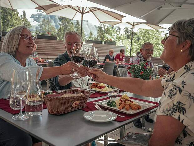Einen schönen Blick geniesst man von der Gartenterrasse aus. In der Mitte des Tisches steht eine Schüssel voller Älplermagronen für die ganze Familie. Danach gibt es hausgemachten Kuchen für alle, die noch ein Dessert schaffen.