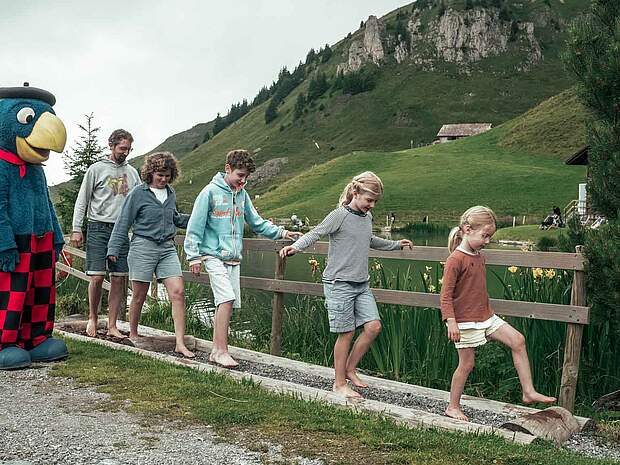 Vorbei am Bergrestaurant und hinauf zum Herzlisee führt eine zauberhafte Fahrt mit dem Sessellift zur Brunnihütte. Viele, viele Menschen hatten den gleichen Plan, die einen wegen des Kneipp-Pfads rund um den Bergweiher. Es ist wunderbar, barfuss zu spüren, was der Boden hergibt. Die anderen scharen sich um die Grillplätze mit Panoramablick, zwischen Bächlein, Schmetterlingen und Wanderschuhen. Es gilt, den Menschenansammlungen auszuweichen und zum Kiosk zu gehen, wo jeder eine Wurst kaufen kann, der nicht mit Grillplätzen auf 1860 Meter über Meer gerechnet hat. Das ganze Angebot ist absolut professionell inszeniert, es macht den Ausflug in die Berge zu einem garantiert glücklichen Unterfangen. Man fühlt sich versorgt, ja bespasst in diesem Vergnügungsareal auf hohem Niveau im doppelten Sinn in schönster Landschaft.