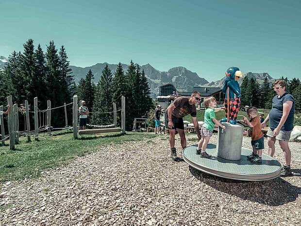 Nein, für Ruhesuchende und Puristen ist das nichts. Jedenfalls nicht hier oben auf dem Engelberger Brunni, nicht auf den ersten Atemzug in der herrlich frischen Sommerluft. Dabei war der Blick ins Tal schon in der Gondel der Luftseilbahn hoch zum Ristis herrlich: Alles bleibt unten, wird klein und kleiner, das Kloster, die Souvenirshops, der Alltag und seine Lasten. Oben ist viel los: Alpines Schlagerfestival im Berglodge- Restaurant Ristis. Es haben sich unzählige Familien eingefunden, auch Globi ist da. Das freut den Nachwuchs, der allerdings kaum Zeit hat, den blauen Vogel zu grüssen. Denn ein Spielplatz voller Wunder wartet darauf, erobert zu werden – eine waghalsige Rutschbahn und ähnliche Freuden, wer könnte widerstehen? Und plötzlich kommt Kindergebrüll auf, weil die Sommerrodelbahn, der Sunshine Radio Runner, ungeplant für kurze Zeit schliessen muss – Regentropfen haben die Fahrbahn gefährlich glitschig werden lassen.