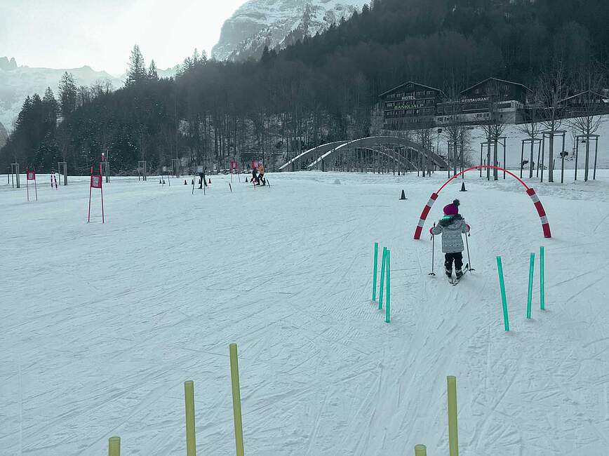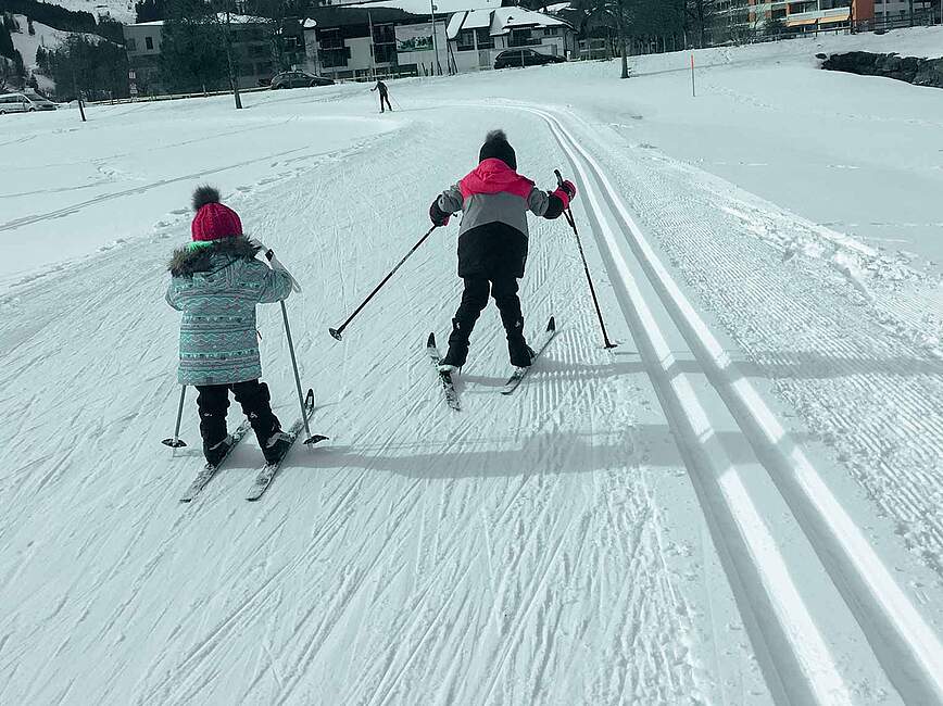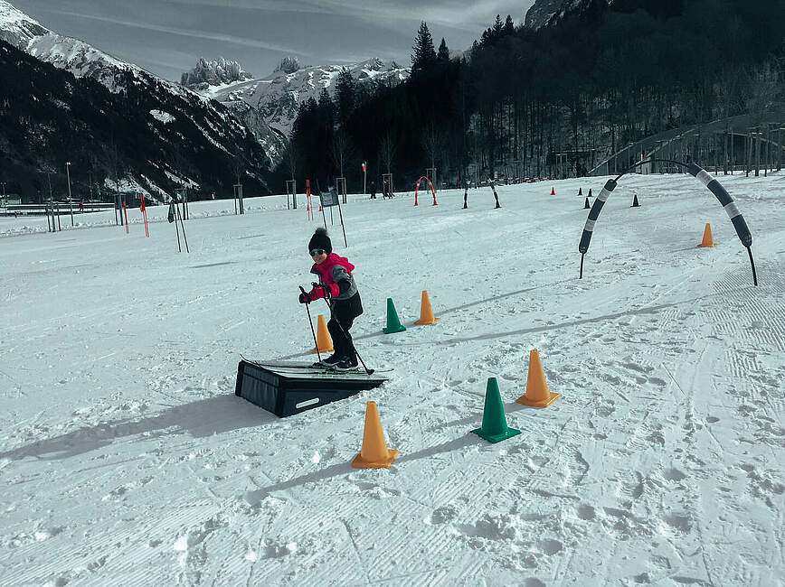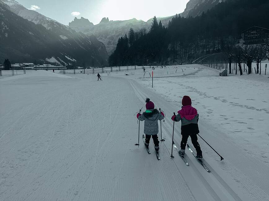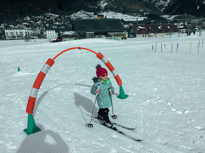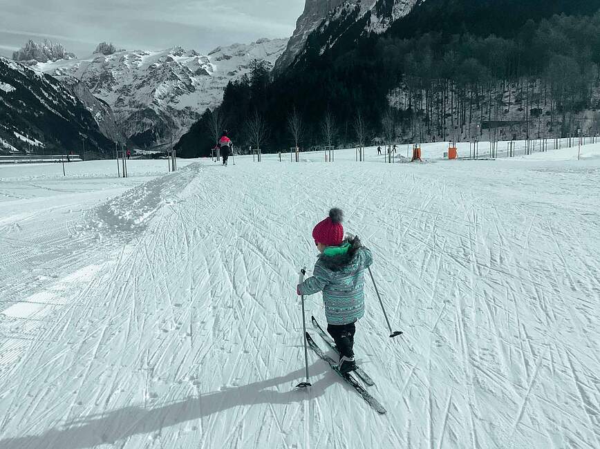 Nun gut, eine Saison später hatte sie mich weichgeklopft und wir liehen uns eine Ausrüstung aus. Vom ersten Moment an war sie hell begeistert und ich staunte, wie gut sie sich bewegte. Am meisten Freude hatte sie daran, einen kleinen Anstieg zu meistern und es anschliessend hinuntersausen zu lassen.